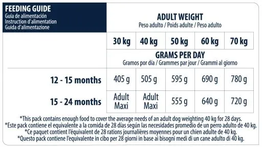 Alimento di alta gamma indicato in particolar modo per cuccioli (dai 12 ai 24 mesi), di razza grande (con più di 30 kg. di peso) che comprende: