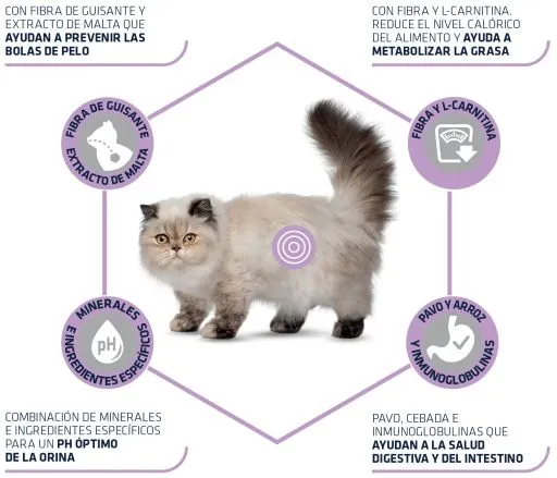 Alimento di qualità superiore adatta per gatti sterilizzati con problemi di formazione di palle di pelo che aiuta a prevenire l’obesità nei gatti sterilizzati: Grazie ad un’energia ridotta metabolizzabile, ad un alto livello di fibra per promuovere la sazietà, e un alto livello di proteine e un livello moderato di grassi per aiutare a mantenere la massa musculare. Aiuta a ridurre il rischio di problemi urinari: Facilita un pH adeguato, aumentando il livello di sodio per aumentare l’assunzione di acqua e produzione di urina, e l’aggiunta di glicosaminoglicani per aiutare la formazione di calcoli urinari. Fibra avena e estratto di malto: aiuta a controllare la formazione delle palle di pelo e facilitare la sua rimozione.