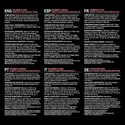 Alimento premium per cani adulti di tutte le razze, a base di salmone, riso e ingredienti naturali di alta qualità. Realizzato con un alto contenuto di pesce come fonte di proteine di alto valore biologico che forniscono un grande appetito e digeribilità. Con un equilibrio ottimale tra proteine, acidi grassi essenziali (Omega 3 e 6), minerali, vitamine e fibre di cui il tuo cane ha bisogno per una buona salute.