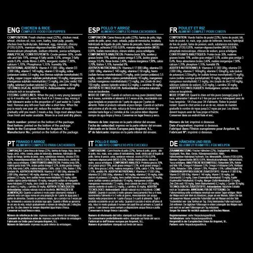 Cibo per cani, a base di carne fresca di pollo e riso, per cuccioli e madri incinte o in allattamento. Formulato con ingredienti di alta qualità che costituiscono la base per una crescita perfetta.