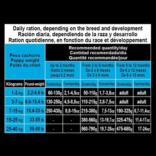 ISTRUZIONI PER L’USO: Quando il cucciolo è molto giovane (svezzamento) fino a 4 mesi di età, alimentare 4 o 5 volte al giorno, mescolando con acqua calda in un rapporto di 1 parte di acqua a 3 parti di cibo. Rimuovere il prodotto in eccesso dopo poco tempo. Quando il cucciolo ha quasi un anno di età, riducete gradualmente il numero di pasti a 2 pasti al giorno. I cani devono sempre avere a disposizione acqua fresca e pulita. Conservare in un luogo fresco e asciutto.