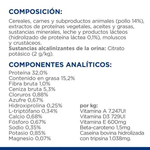 Composizione: cereali, carni e sottoprodotti animali (14% di pollo), estratti di proteine di verdure, olii e grassi, sostanze minerali, latte e prodotti lattiero-caseari (idrolizzato proteico del latte 0,1%), molluschi e crostacei. Sostanze di urina alcalining: Citrato di potassio (2 g / kg).