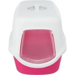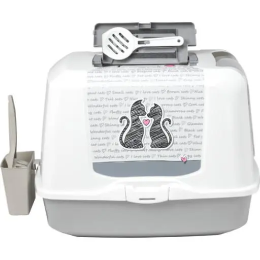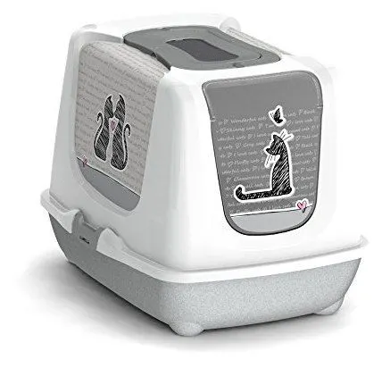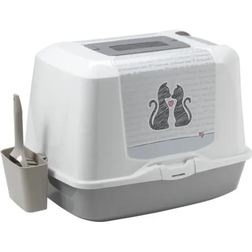 Lettiera rivestita in plastica con maniglia, porta di accesso rimovibile, paletta e filtro a carbone, comoda e di ottima qualità.