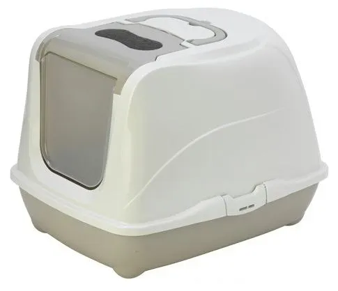 Lettiera rivestita in plastica con maniglia, porta di accesso rimovibile, paletta e filtro a carbone, comoda e di ottima qualità.