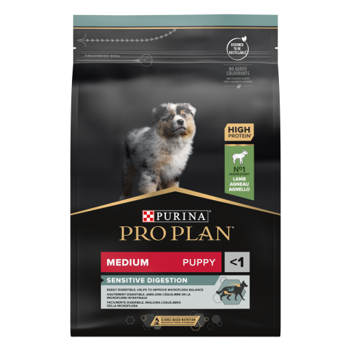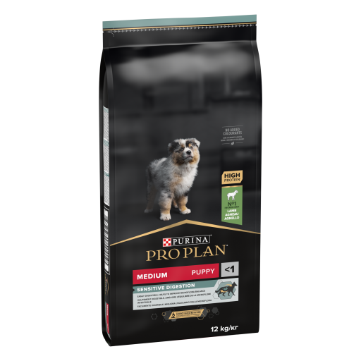 PURINA® PRO PLAN® Medium Puppy Sensitive Digestion con OPTIDIGEST® ricco di agnello è un alimento secco completo per cuccioli di razza media con digestione sensibile. È adatto anche per le femmine in gravidanza e in allattamento.