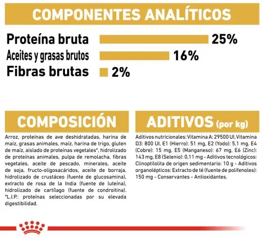 COMPOSIZIONE: riso, proteine di pollame disidratate, farina di mais, grassi animali, mais, farina di frumento, glutine di mais, proteine vegetali isolate*, idrolizzato di proteine animali, polpa di barbabietola, sali minerali, fibre vegetali, olio di pesce, olio di soia, frutto-oligosaccaridi, olio di borraggine, estratti di tè verde e di vinacce (fonte di polifenoli), idrolizzato di crostacei (fonte di glucosamina), estratto di fiore di Tagete (fonte di luteina), idrolizzato di cartilagine (fonte di condroitina).