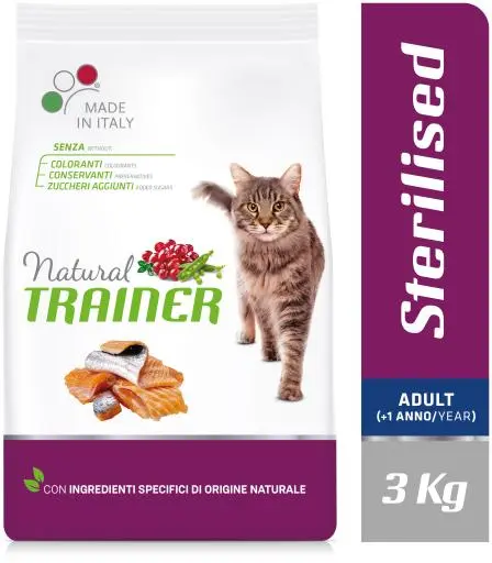 L’imballaggio può subire modifiche a causa di aggiornamenti del marchio. Natural Trainer Adult Sterilised, prodotto con salmone e ingredienti funzionali come il mirtillo rosso o la mentuccia, copre tutte le necessità del vostro gatto sterilizzato.