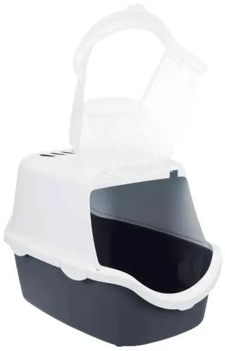 Lettiera per gatti con coperchio, porta a battente, paletta e maniglia. Ha un filtro a carbone attivo che neutralizza i cattivi odori e ha una parte anteriore incernierata per una facile pulizia, compreso un doppio bordo che impedisce la fuoriuscita di urina e lettiera dal vassoio. Le chiusure a scatto rendono l’apertura e la chiusura più rapida e facilitano anche la pulizia. Dimensioni 40x40x56 centimetri.